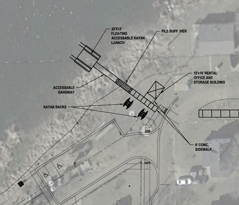 Proposed ADA floating kayak launch, kayak racks, and rental building.